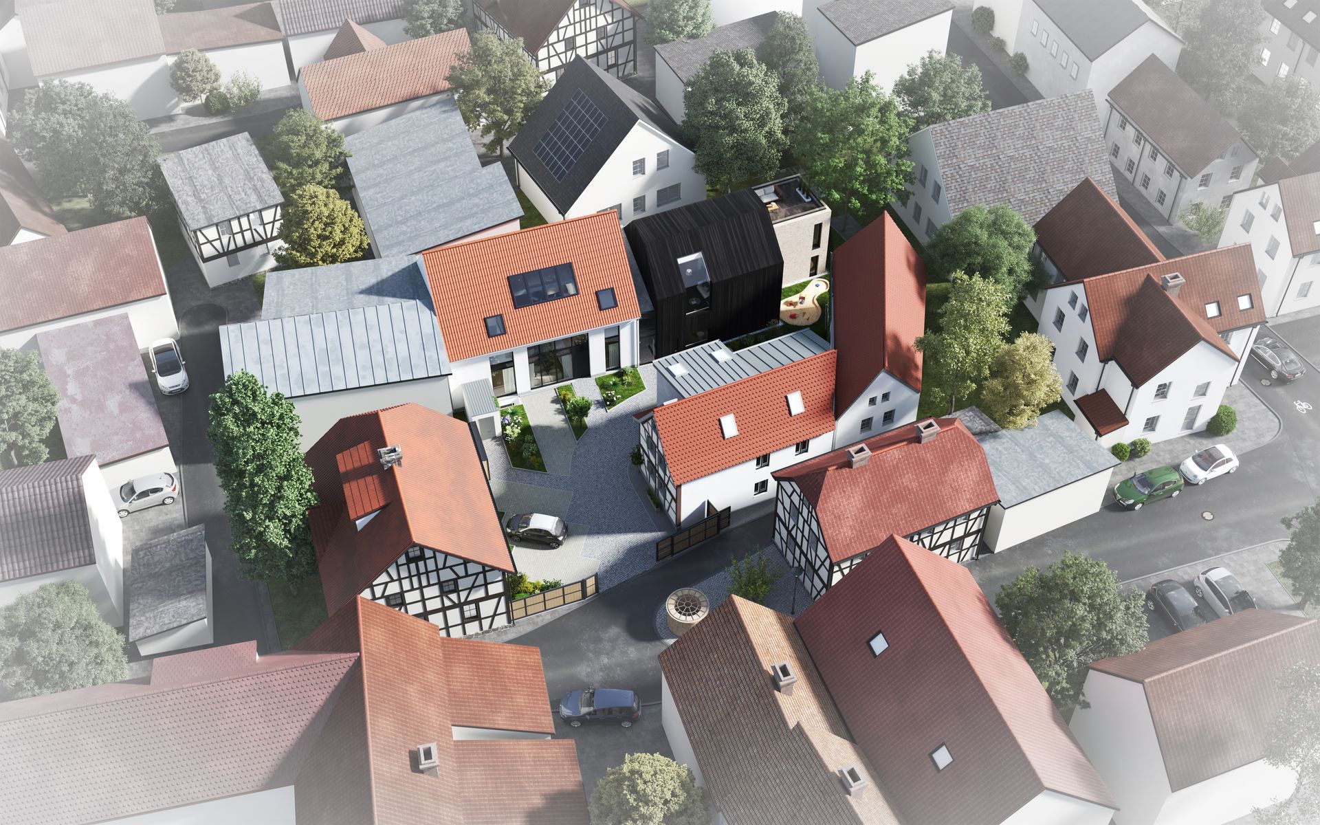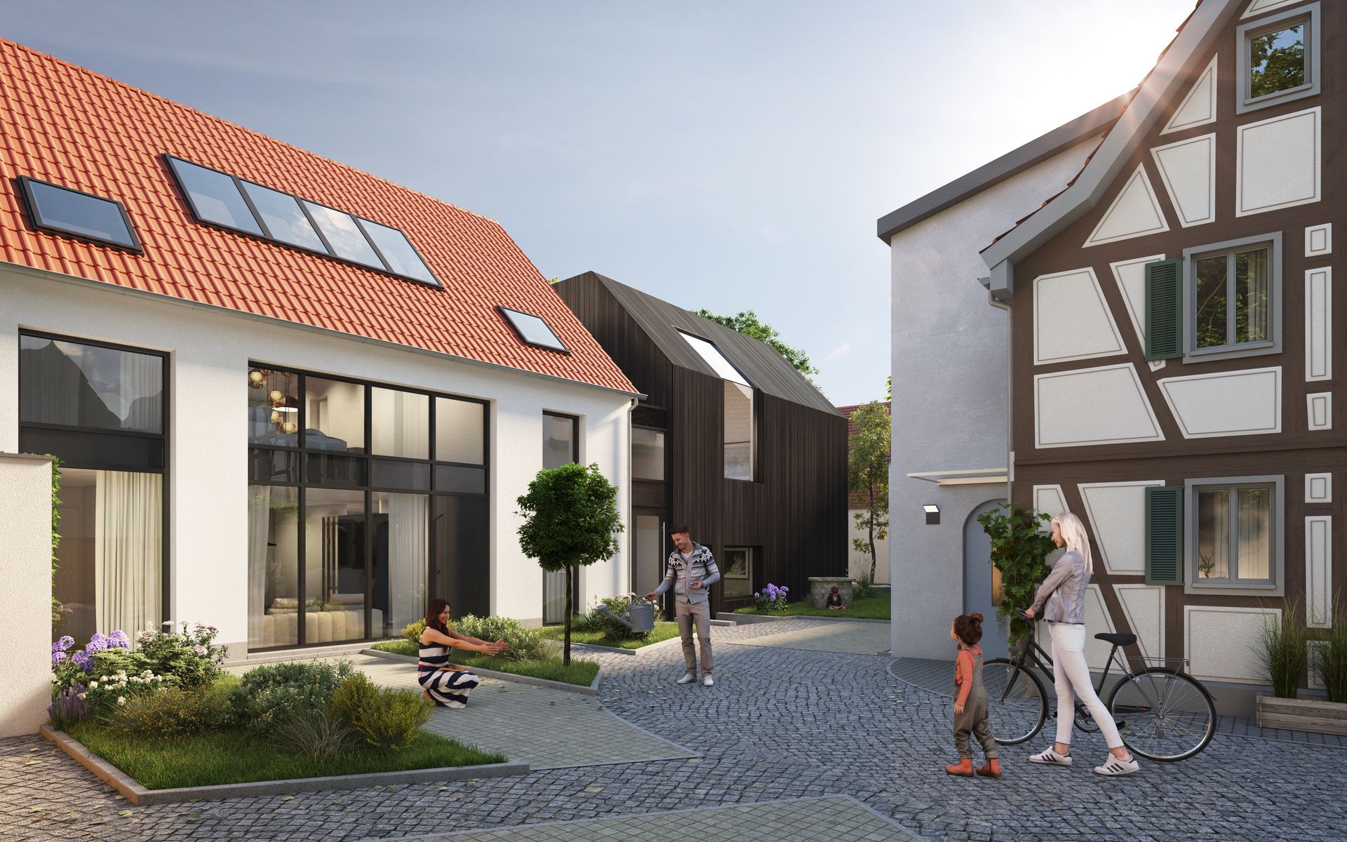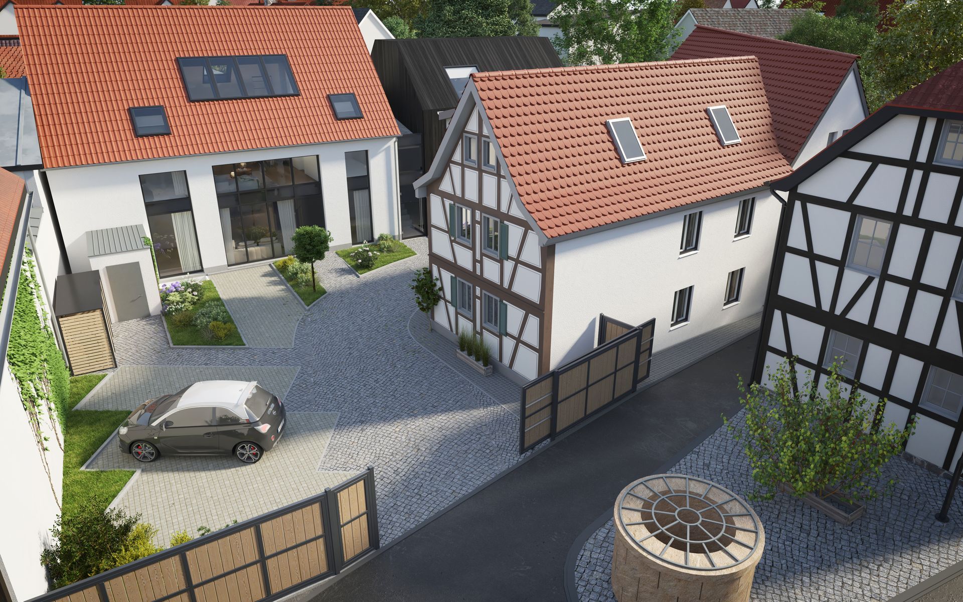 Das neu entstehende Ensemble befindet sich auf einem 691 m², großem Grundstück. Es verfügt über 4 neue Wohneinheiten, die sich auf drei Geschosse plus Keller verteilen sowie ein bereits fertiggestelltes Fachwerkhaus mit