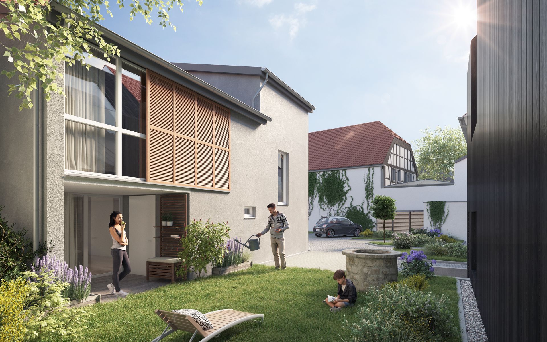 Die barrierefreien Erdgeschosswohnungen erhalten Nutzungsrecht an der kleinen, aber feinen Außenfläche. Pflanzen Sie Blumen und Kräuter im eigenen Gärtchen oder errichten Sie sich einen Grillplatz! Ein großer Hof mit 5 PKW-Parkplätzen, E-Ladestation auf Wunsch sowie Abstellmöglichkeiten für Fahrräder lässt Raum zum Sitzen, Treffen, Spielen, Zusammenkommen - gleichermaßen perfekt für Jung und Alt, für Familien, Paare oder Singles.