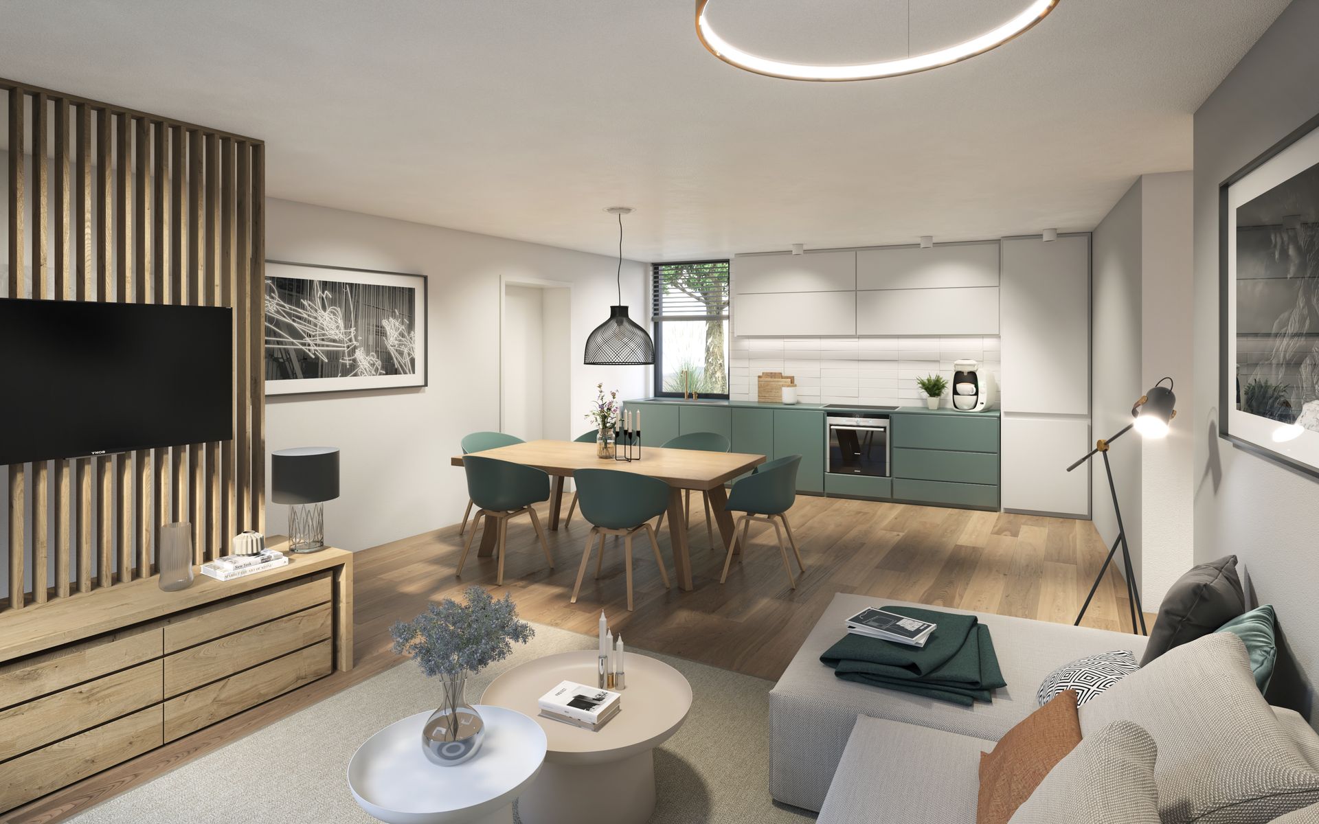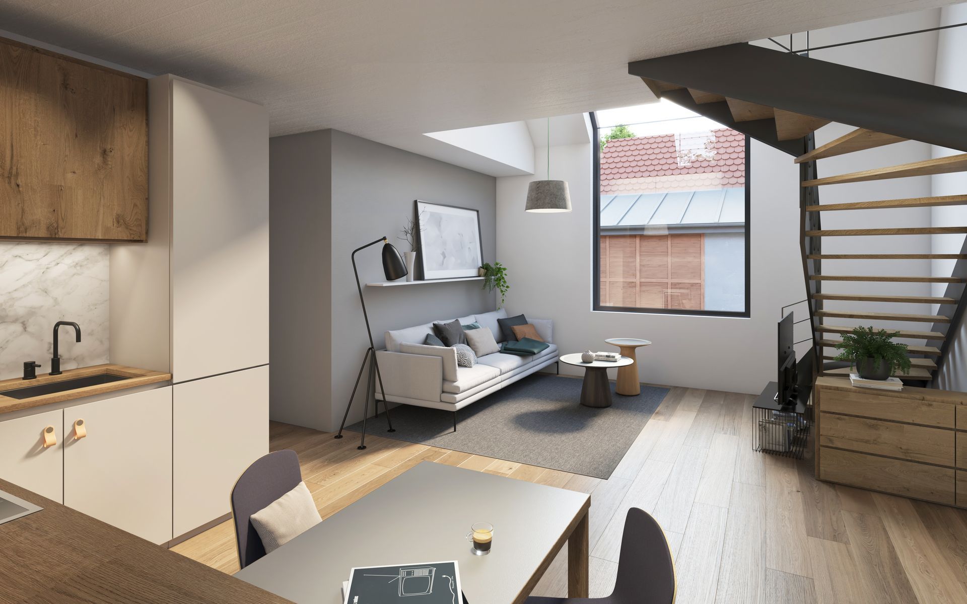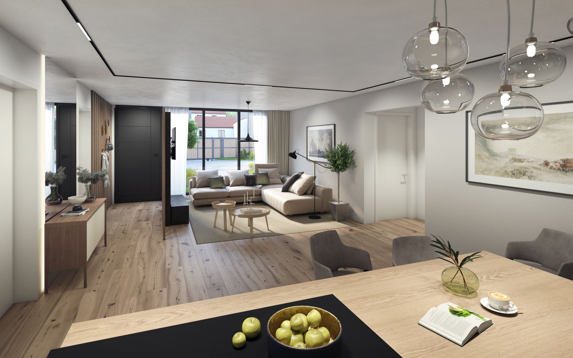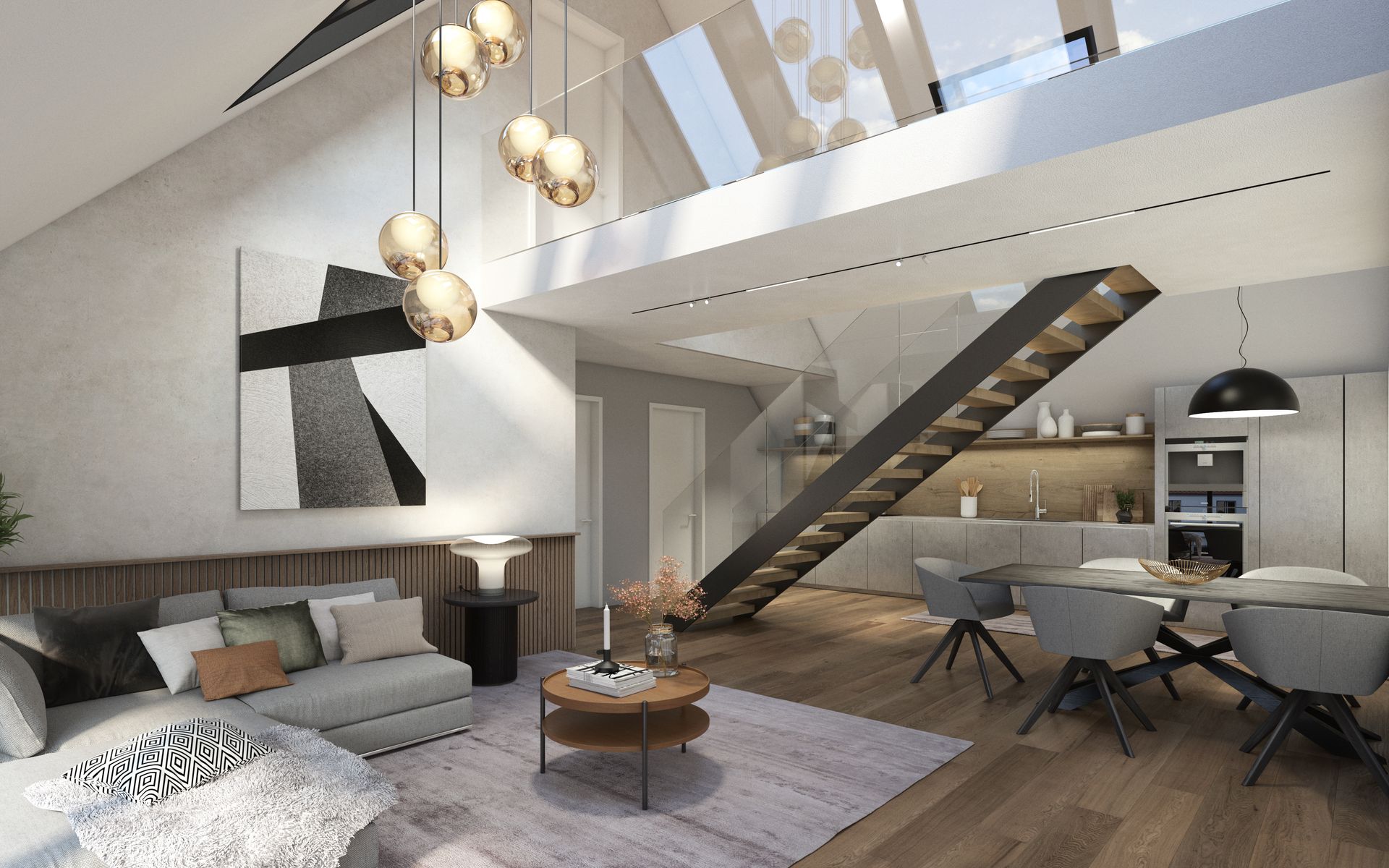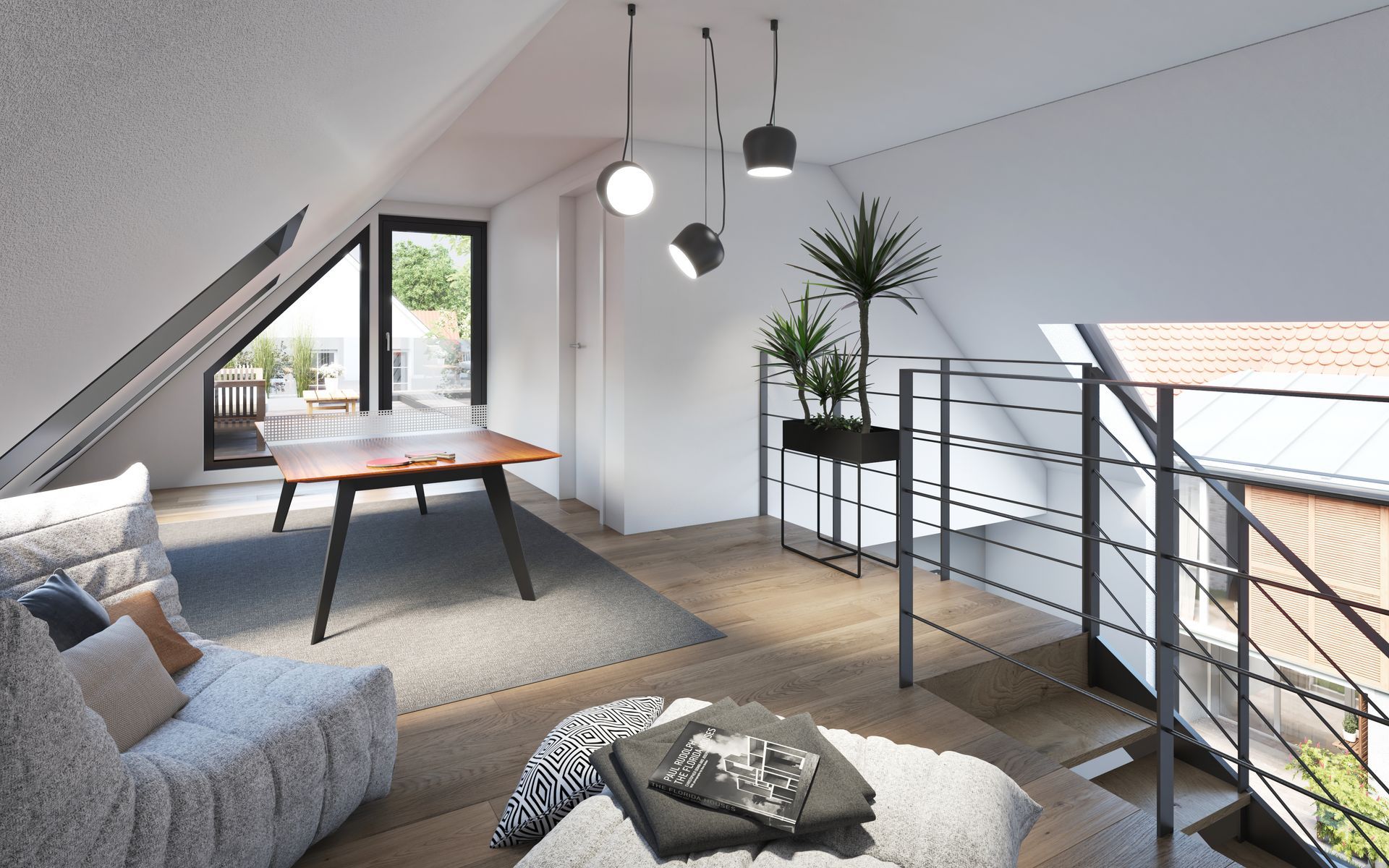 Maisonette geschnitten und verfügen über großflächige Verglasung. Der Begleitbau bietet zusätzlich einen großzügigen West-Balkon mit Blick ins Grüne.